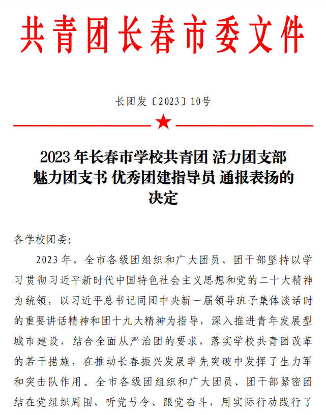 近日,我校在2023年长春市学校共青团“活力团支部”“魅力团支书”“优秀团建指导员”寻访活动中喜获佳绩。